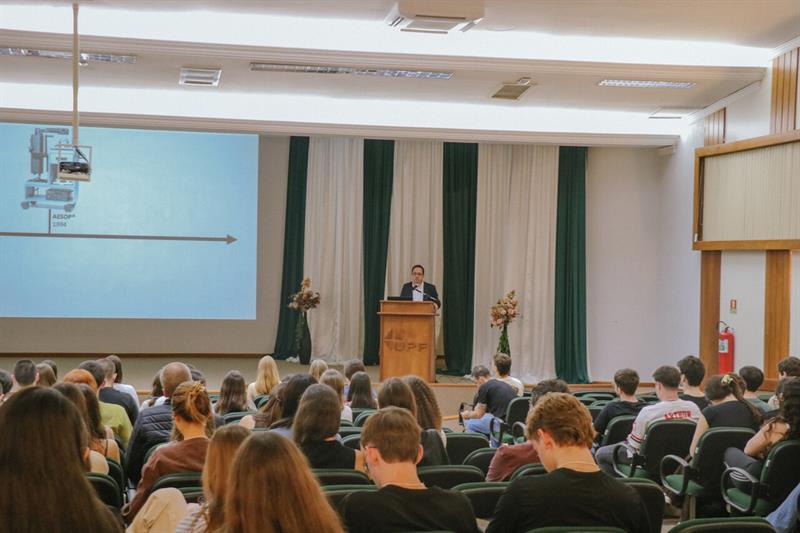Na sequência, a programação abordou o tema da inovação tecnológica na área cirúrgica com a palestra do médico Jorge M. Carlotto, egresso da graduação em Medicina pela UPF e professor de Anatomia Médica e do internato em Cirurgia da instituição. Durante a apresentação, ele discutiu o tema “Cirurgia Robótica e Telemedicina: o futuro é agora”, destacando os avanços tecnológicos que têm transformado a prática cirúrgica e ampliado as possibilidades de atendimento e cuidado aos pacientes.
