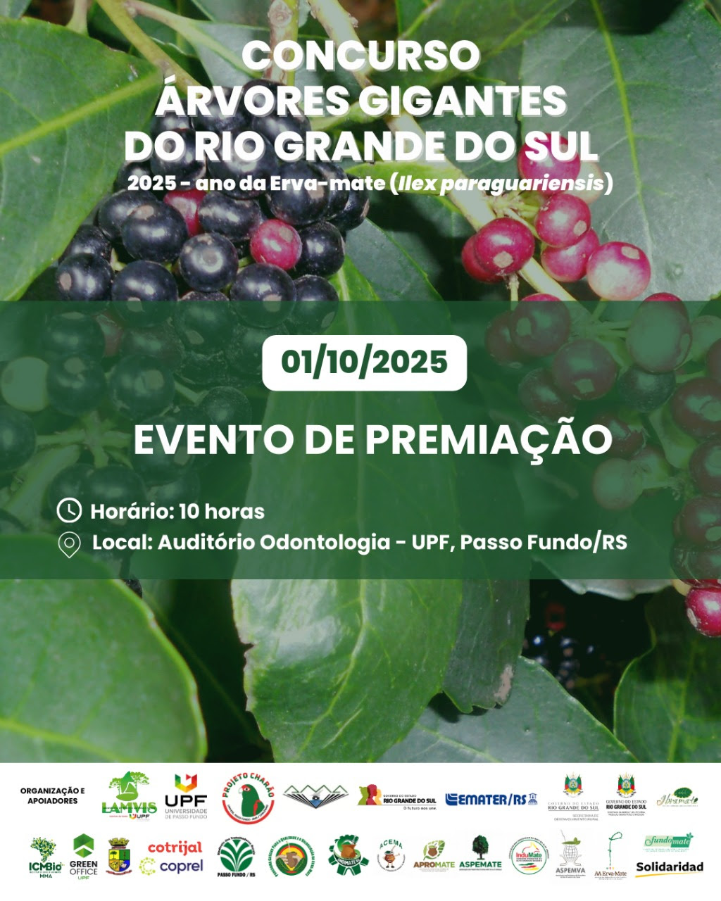 A segunda edição do Concurso Árvores Gigantes do Rio Grande do Sul busca identificar e premiar os maiores exemplares arbóreos de erva-mate existentes no estado. Para isso, a iniciativa conta com a participação dos cinco polos ervateiros do RS, além de entidades como Ibramate, Sindimate, Secretaria Estadual da Agricultura, Projeto Charão/AMA, Associações de Produtores de Erva-mate, Cotrijal, Coprel e ICMBio-Floresta Nacional de Passo Fundo.