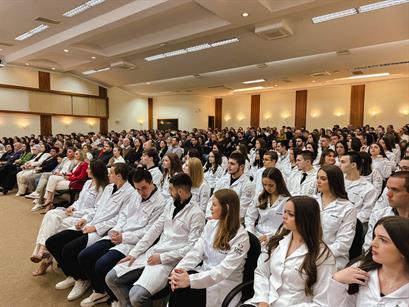 Após cerca de um mês de aulas, os acadêmicos receberam o jaleco que os acompanhará durante os seis anos de graduação e seguirá presente em sua futura atuação profissional. No ato, também prestaram juramento, comprometendo-se a usá-lo com respeito e cuidado não apenas com a própria saúde, mas principalmente com a de seus futuros pacientes.