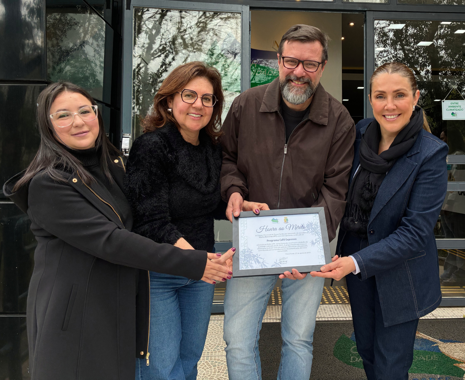 A vereadora Marina falou que era uma honra homenagear os 10 anos do programa. “É histórico, em que precisamos, cada vez mais, de profissionais e espaços comprometidos com o enfrentamento à desinformação, o Café Expresso tem uma forte e responsável atuação social. Celebramos uma década de uma história que já faz parte da memória afetiva e auditiva de Passo Fundo e região. Criado em 2015, o Café Expresso consolidou-se como um dos programas mais longevos da emissora e é referência em informação de qualidade”, enfatizou.