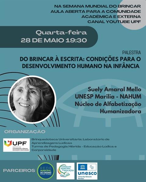 A Universidade de Passo Fundo (UPF) realizará, nesta quarta-feira, 28 de maio, uma aula aberta online sobre estudos da infância, às 19h30. O evento, que integra as atividades da Semana Internacional do Brincar e da curricularização da extensão na disciplina de Educação Lúdica e Corporeidade do Curso de Pedagogia (modalidade híbrida), contará com a participação da Profª Drª Suely Amaral Franco, da Unesp.